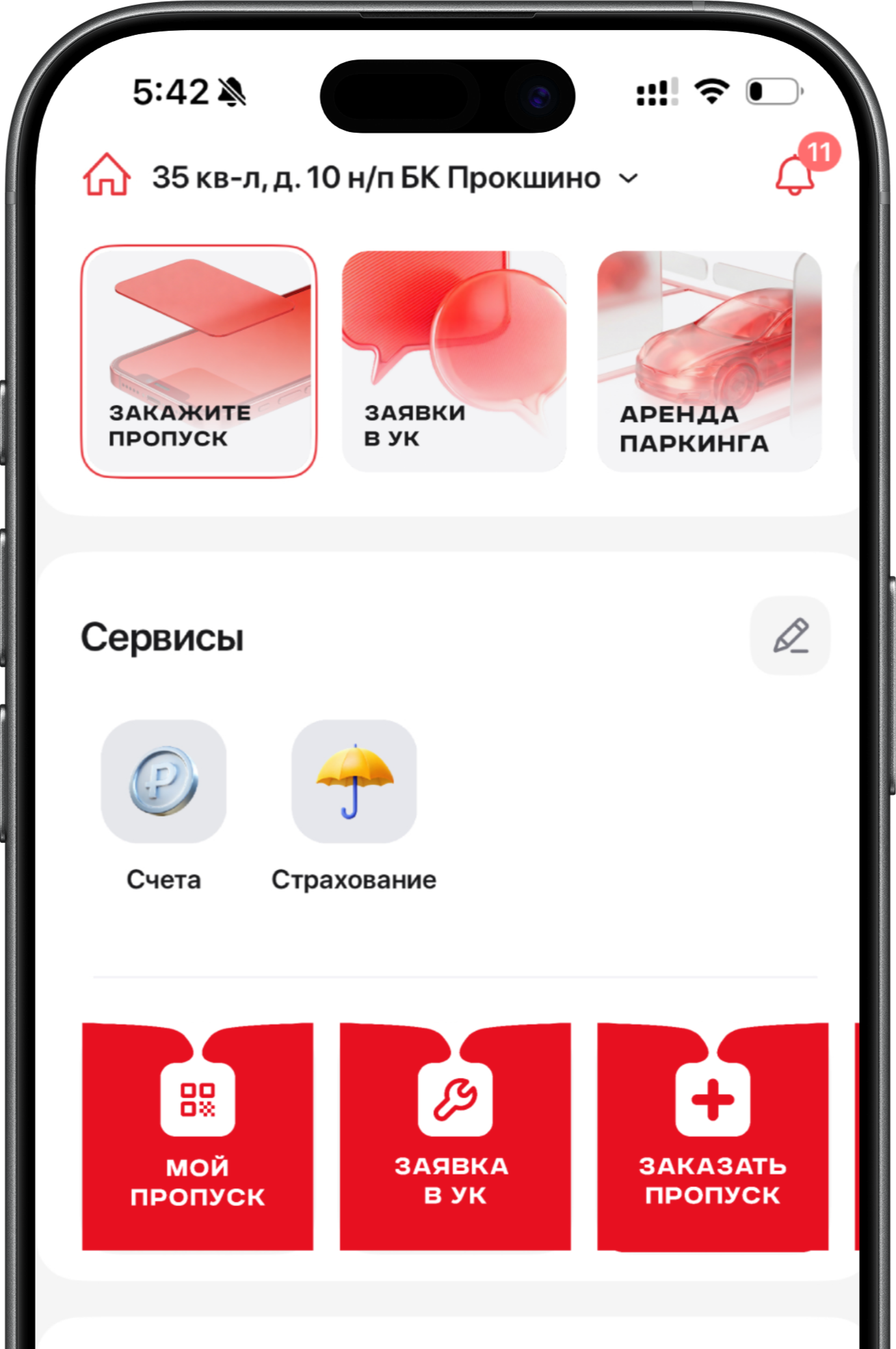 Если вы хотите перевыпустить свою ключ-карту, у вас не срабатывает QR-код или заказать временный пропуск для гостей офиса, кликните по кнопке «Заказать пропуск» на главной странице. Когда ключ-карта (QR-код) будет готова, мы сообщим об этом в чате заявки в разделе «Сервис» (и в пуш-уведомлении).